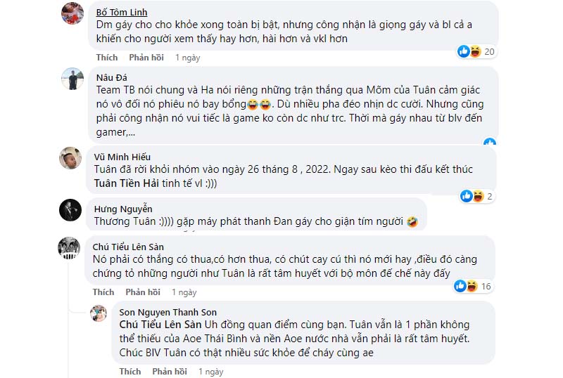 Bên dưới bài đăng của Đan Toni, khán giả đã để lại nhiều bình luận hài hước. Trong đó có khá nhiều lời khen về sự tâm huyết và chất lửa của Tuân Tiền Hải với Clan AoE Thái Bình.