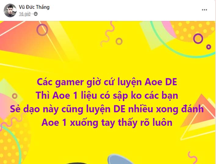 Cụ thể trong bài đăng gần đây ở group Chim Sẻ Đi Nắng, một khán giả đã đặt một câu hỏi liên quan đến tương lại AoE 1. Anh cho rằng các game thủ lâu nay đang luyện tập AoE DE nhiều và lo lắng rằng AOE 1 sẽ bị sập. Không như thế, để chứng minh cho quan điểm của mình, vị khán giả này còn đưa ra dẫn chính tờ từ chính Chim Sẻ. Anh khẳng định Chim Sẻ đang xuống tay khi đánh AoE 1 khi dành nhiều thời gian để luyện tập AoE DE.